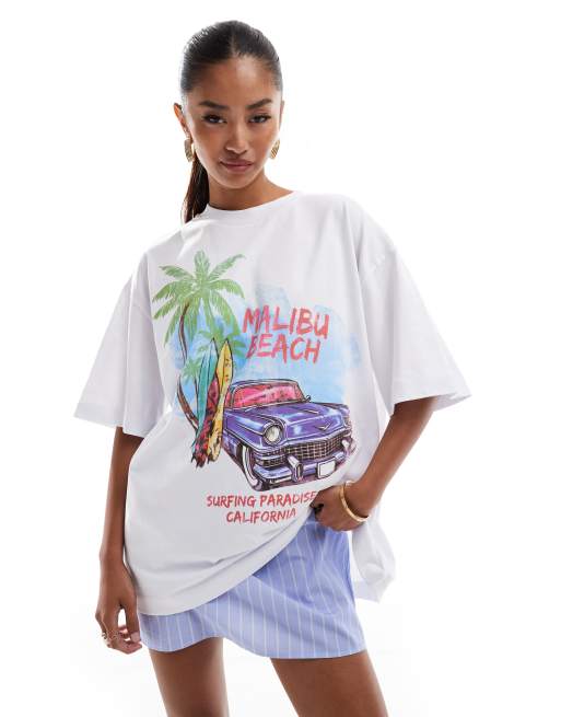 ASOS DESIGN – Oversize-T-Shirt mit „Malibu Beach“-Print in Weiß