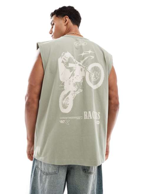 ASOS DESIGN – Oversize-Tanktop in verwaschenem Khaki mit Motorrad-Print