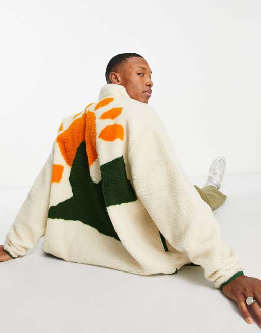 ASOS DESIGN – Oversize-Teddyjacke in Cremeweiß mit Reißverschluss und Sonnenmotiv am Rücken
