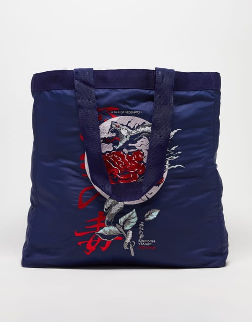 ASOS DESIGN – Oversize-Tragetasche in Marineblau mit Drachenstickerei