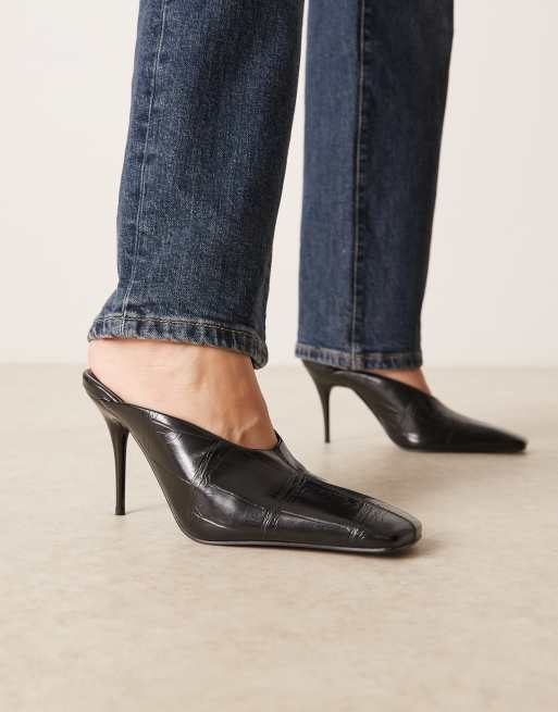 ASOS DESIGN – Pablo – Ultimate – Mules in Kroko-Schwarz mit eckiger Zehenpartie und hohem Absatz