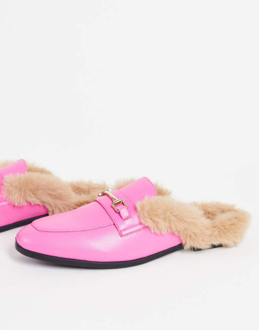 ASOS DESIGN – Pantoletten-Loafer aus Kunstleder in leuchtendem Rosa mit natürlichem Kunstpelzbesatz