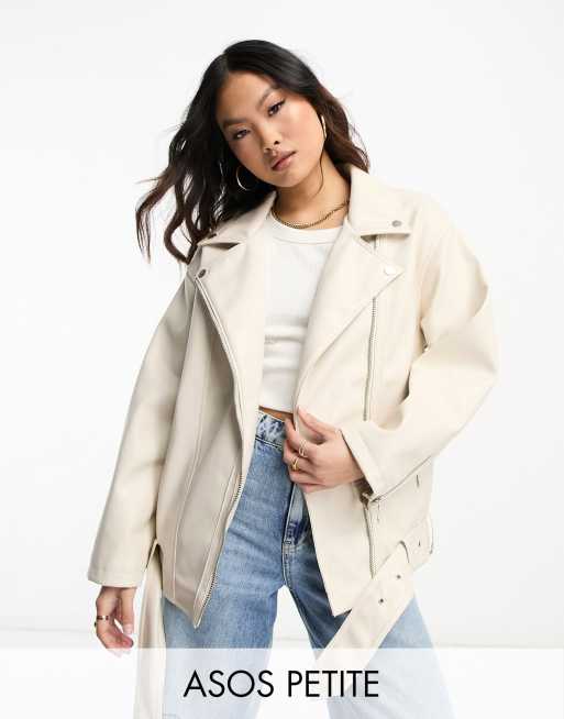 ASOS DESIGN Petite – Lang geschnittene Oversize-Bikerjacke aus Kunstleder in Ecru
