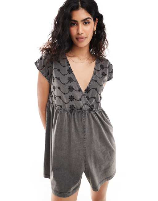 ASOS DESIGN – Playsuit in grauer Waschung mit gewickelter Vorderseite und schwarzer Stickerei