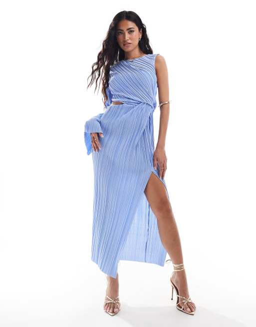 ASOS DESIGN – Plissee-Midikleid in Eisblau mit einem Ärmel und Schlitzdetail