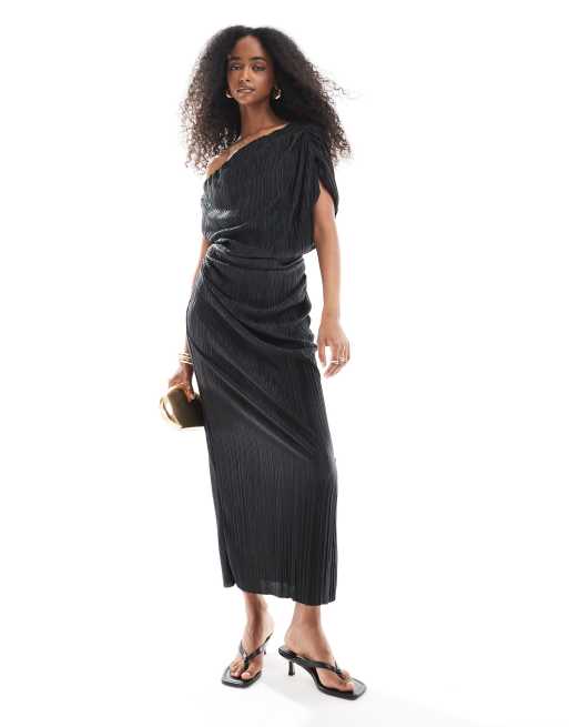 ASOS DESIGN – Plissee-Midikleid in Schwarz mit abfallender Schulterpartie