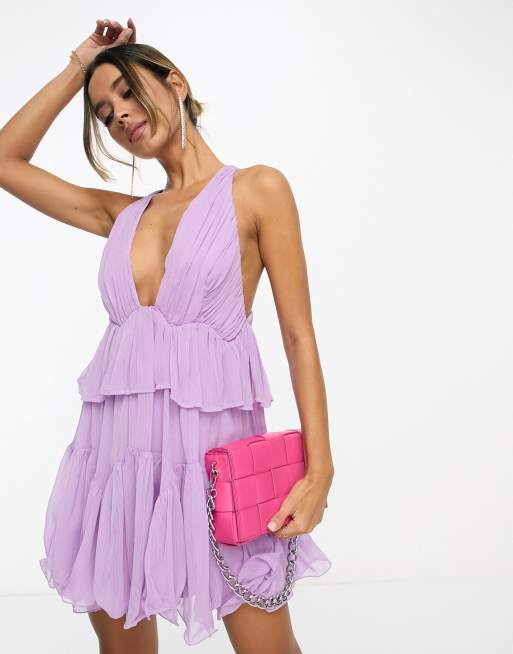 ASOS DESIGN – Plissiertes, gestuftes Minikleid in Lila mit tiefem Ausschnitt
