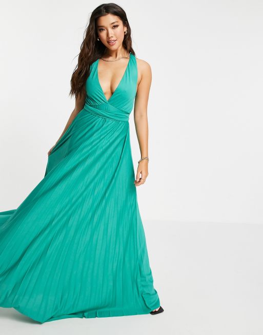 ASOS DESIGN – Plissiertes Maxikleid in Aqua mit tiefem Ausschnitt, hinten gekreuztem Neckholderträger und Bindedetail