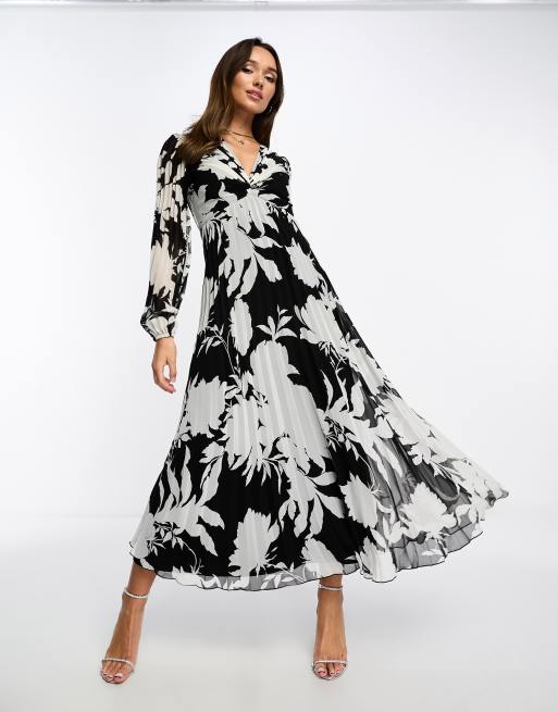 ASOS DESIGN – Plissiertes Midikleid mit Blumenmuster in Schwarz-Weiß und Hauptteil mit tiefem Ausschnitt