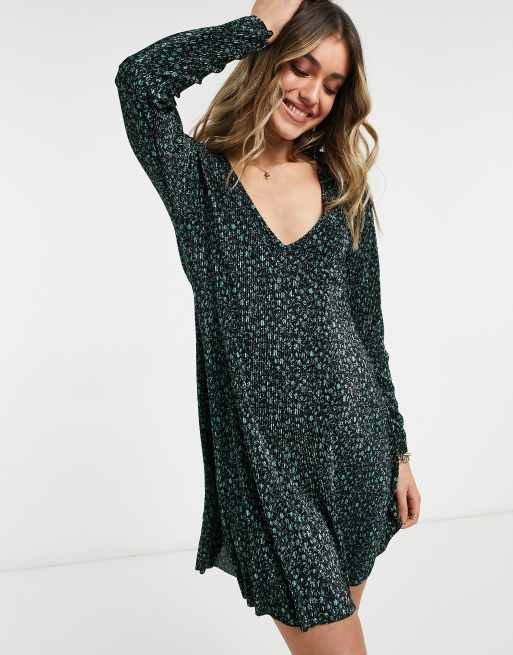 ASOS DESIGN – Plissiertes Minikleid in Schwarz mit V-Ausschnitt und tannengrünem Blümchenmuster