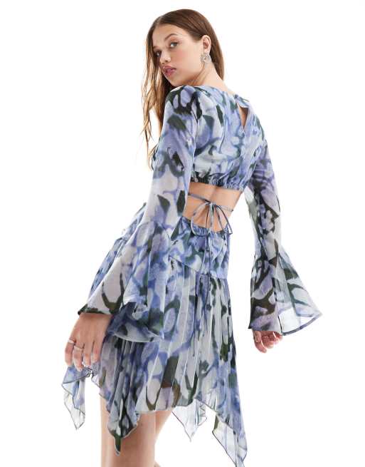 ASOS DESIGN – Plissiertes Minikleid mit blaugrünem, abstraktem Muster und asymmetrischem Saum