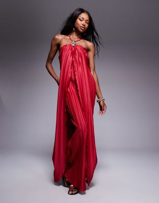 ASOS DESIGN – Plissiertes Neckholder-Maxikleid in Rot mit drapiertem Detail und goldfarbenem Austern-Design