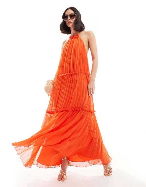 ASOS DESIGN – Plissiertes Neckholder-Maxikleid in Tomatenrot mit Rüschen