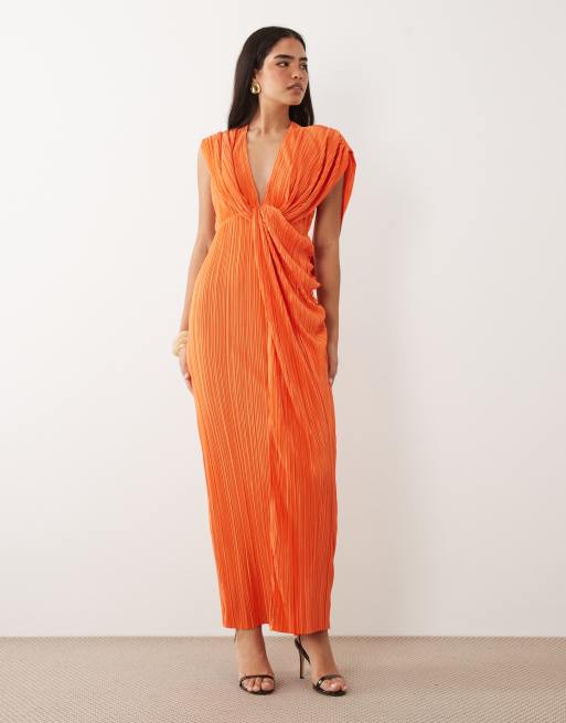 ASOS DESIGN – Plissiertes Neckholder-Midikleid in Orange mit verdrehtem Design