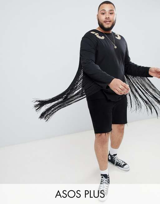ASOS DESIGN Plus – Locker und lang geschnittenes, langärmliges Shirt mit Barock-Folienprint und auffälligen Quasten