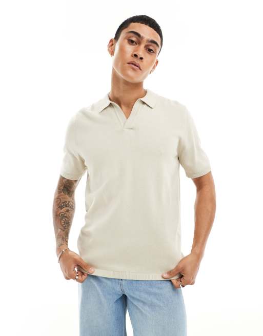 ASOS DESIGN – Polohemd aus leichtem Baumwollstrick in Steinbeige mit eingekerbtem Ausschnitt