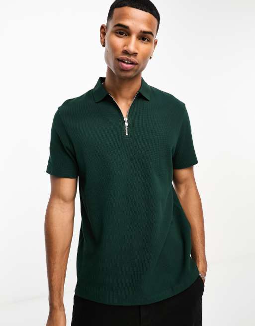 ASOS DESIGN – Polohemd in Dunkelgrün mit Waffelstruktur und Reißverschluss