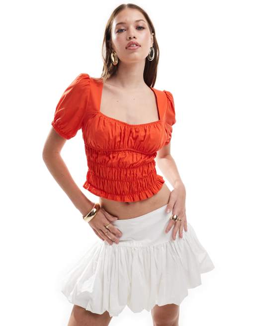 ASOS DESIGN – Popeline-Bluse in Rot mit geraffter Taille und Puffärmeln