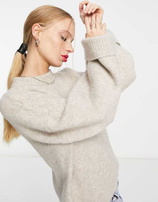 ASOS DESIGN – Premium – Pullover aus Wollmischgarn in Hellbeige mit Bündchen zum Umschlagen