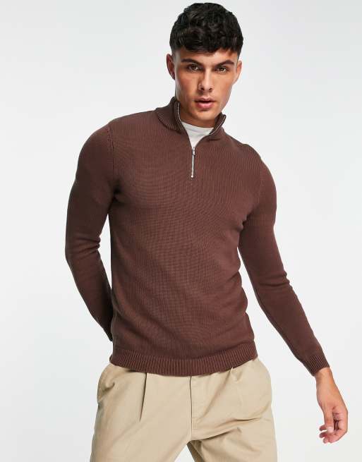 ASOS DESIGN – Pullover aus Baumwolle in Braun mit kurzem Reißverschluss