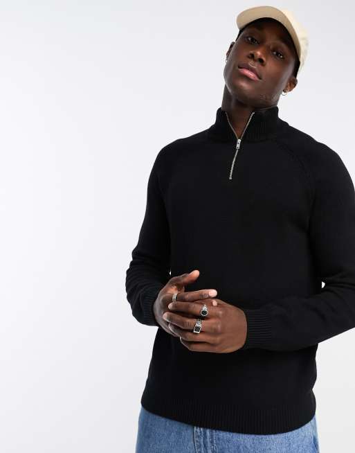 ASOS DESIGN – Pullover aus mittelschwerer Baumwolle in Schwarz mit kurzem Reißverschluss