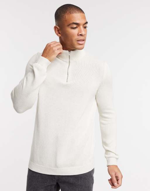 ASOS DESIGN – Pullover aus mittelschwerer Baumwolle in Ecru mit halblangem Reißverschluss