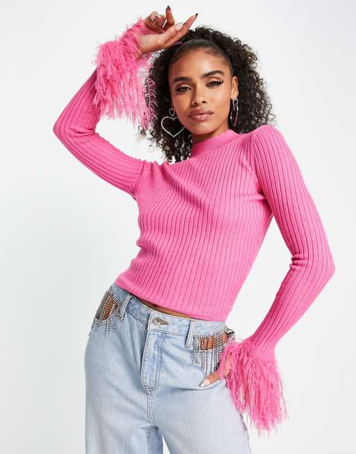 ASOS DESIGN – Pullover in Rosa mit Ärmelbündchen mit Kunstfedern