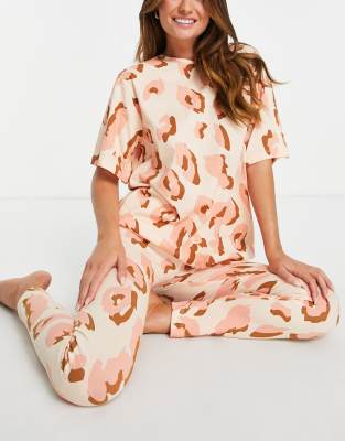 ASOS DESIGN – Pyjama aus Oversize-T-Shirt und Leggings in Rost und Rosa mit abstraktem Animal-Print