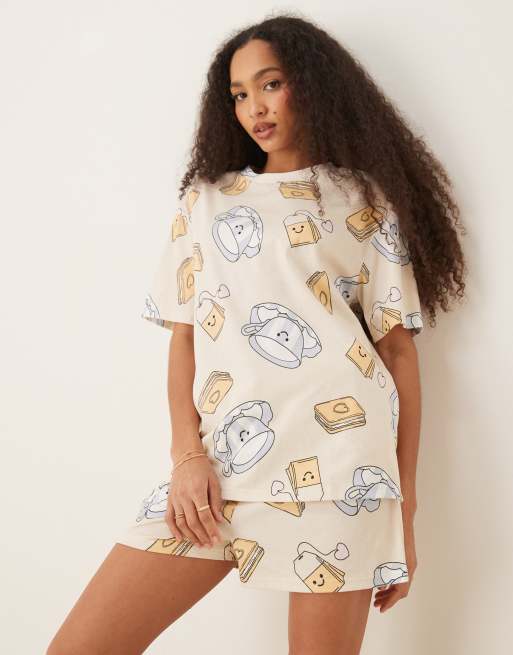 ASOS DESIGN – Pyjama in Cremeweiß mit Tee- und Keks-Muster, aus Oversize-T-Shirt und Shorts