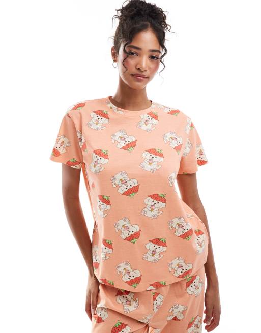 ASOS DESIGN - Pyjama in Rosa mit Cavachon-Hunde-Erdbeermuster bestehend aus T-Shirt Hose mit Bündchen