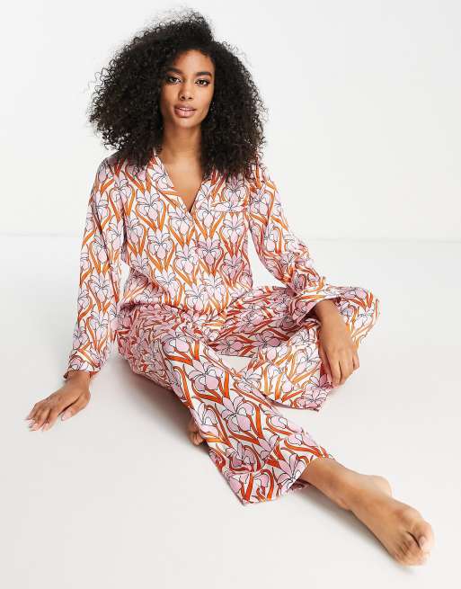 ASOS DESIGN – Pyjama-Set aus Satin mit Hemd und Hose in Rosa und Orange mit geometrischem Print plus Geschenktasche