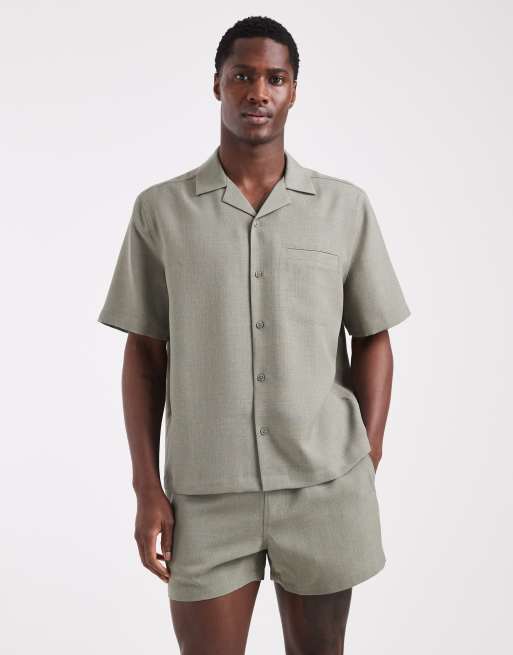 ASOS DESIGN – Relaxed Fit Hemd in khakifarbener Leinen-Optik mit Reverskragen, Kombiteil
