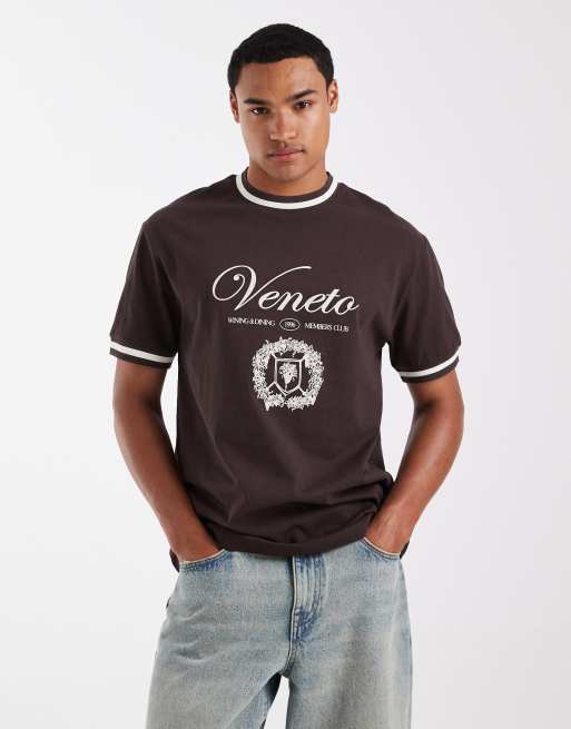 ASOS DESIGN – Relaxed-Fit-T-Shirt in Braun mit Kontraststreifen und gesticktem Grafikdetail