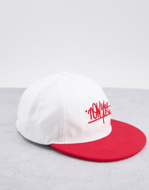 ASOS DESIGN – Retro-Snapback-Cap in Rot und Weiß mit Stadt-Print
