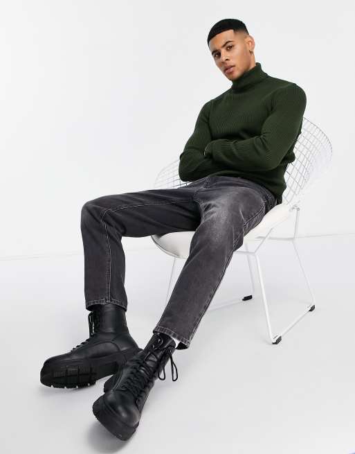 ASOS DESIGN – Rollkragenpullover aus geripptem Strick in Khaki mit Muskel-Schnitt
