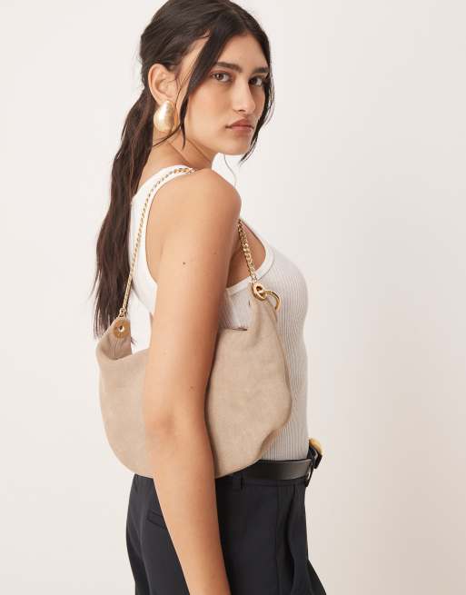 ASOS DESIGN – Runde Clutch-Tasche aus steinbeigem Wildleder in Beutelform mit goldener Metallverzierung und austauschbarem Detail