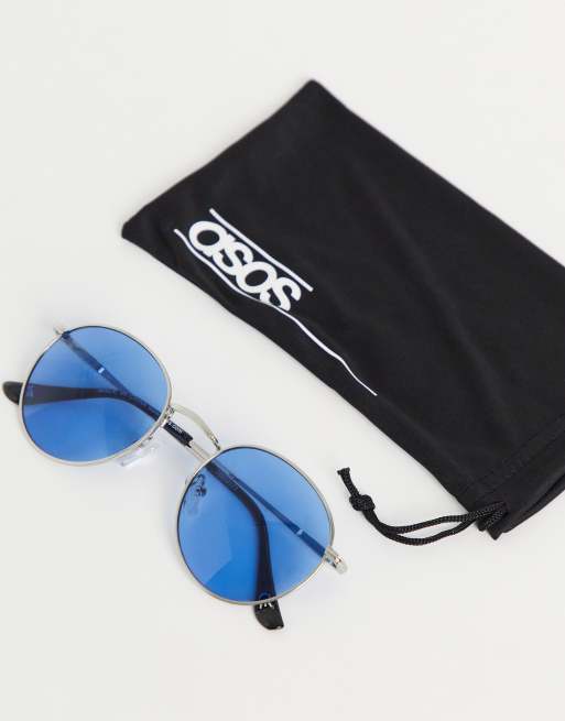ASOS DESIGN – Runde Sonnenbrille aus silbernem Metall mit blauen Gläsern