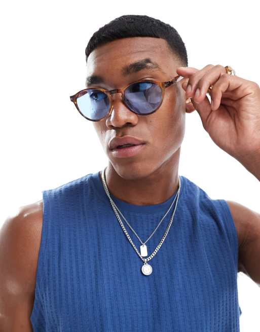 ASOS DESIGN – Runde Sonnenbrille in Schildpatt-Optik mit blauen Gläsern