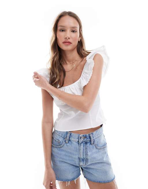 ASOS DESIGN – Rüschenoberteil in Elfenbein mit quadratischem Ausschnitt