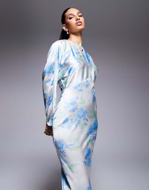 ASOS DESIGN – Satin-Maxikleid in Elfenbeinweiß mit Fledermausärmeln und Blumenmuster