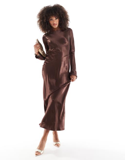 ASOS DESIGN – Satin-Maxikleid in Schokoladenbraun mit Trompetenärmeln und tiefem Rückenausschnitt