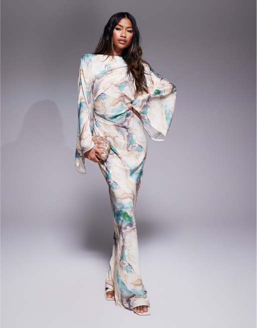 ASOS DESIGN – Satin-Maxikleid mit abstraktem Print und Wickeldesign vorne, Fledermausärmeln und Schrägschnitt