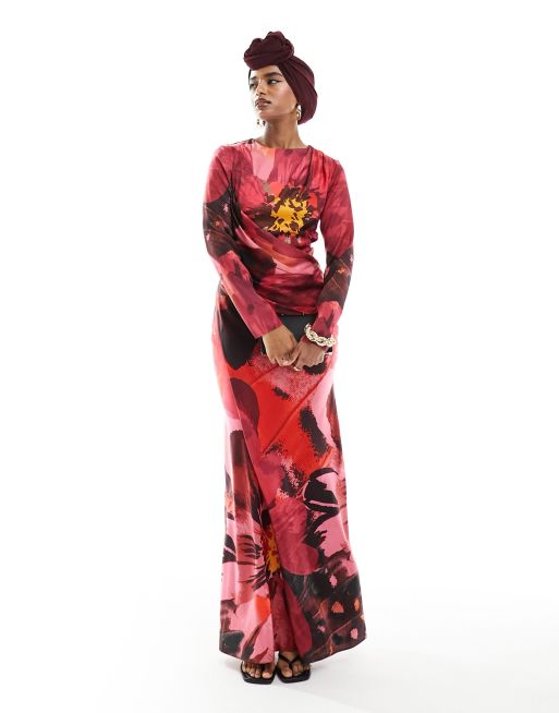 ASOS DESIGN – Satin-Maxikleid mit Drapierung und großem rosa Blumenmuster