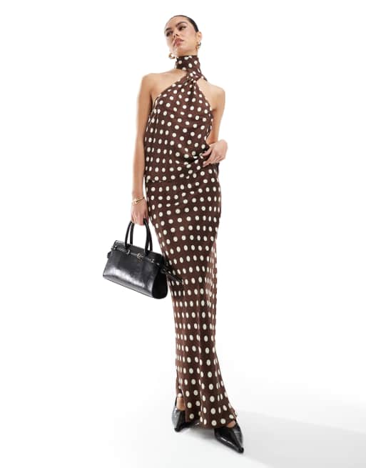 ASOS DESIGN – Satin-Maxirock in gepunktetem Schokobraun mit Bias-Cut, Kombiteil