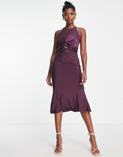ASOS DESIGN – Satin-Midikleid in Weinrot mit Zierknoten vorne und Rückenschnürung