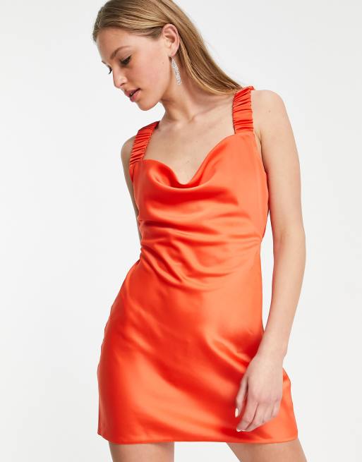 ASOS DESIGN – Satin-Minikleid in Rot mit Wasserfallausschnitt vorne und gerafften Trägern