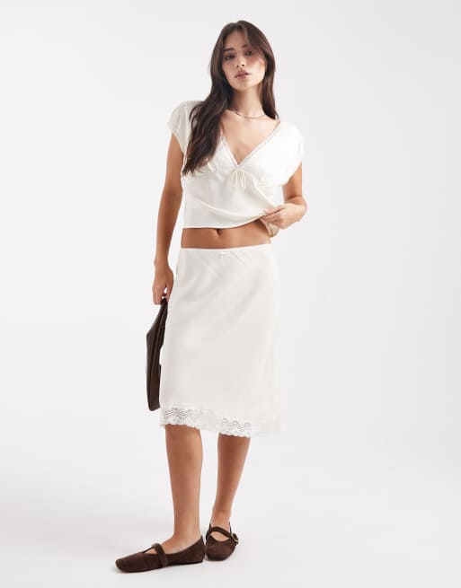ASOS DESIGN – Satin-Set in Elfenbeinweiß mit Spitzenborte