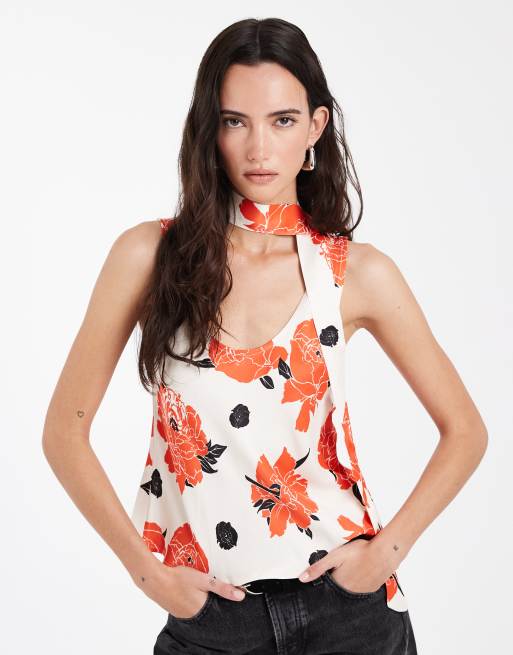 ASOS DESIGN – Satin-Tanktop mit U-Ausschnitt, Schaldetail und Blumenmuster