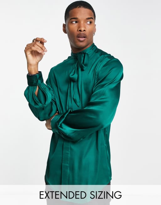 ASOS DESIGN – Satinhemd in Juwelen-Grün mit Schnürung am Ausschnitt und voluminösen Blousonärmeln
