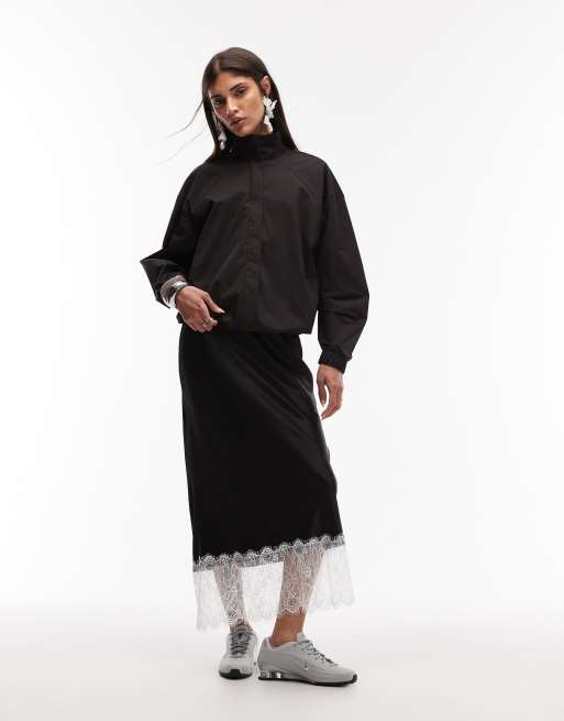 ASOS DESIGN – Satinrock in Schwarz mit farblich abgesetztem Saumdetail aus Spitze